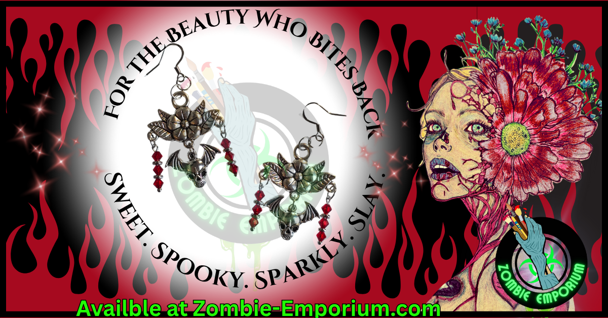 Bring a blend of whimsical bloom and dark fantasy into your style with our Flower Chandelier Skullbat Earrings — a bold, gothic accessory inspired by Meadow, the haunting meadow-dwelling Beauty from Zombie Beauties in Bloom.
