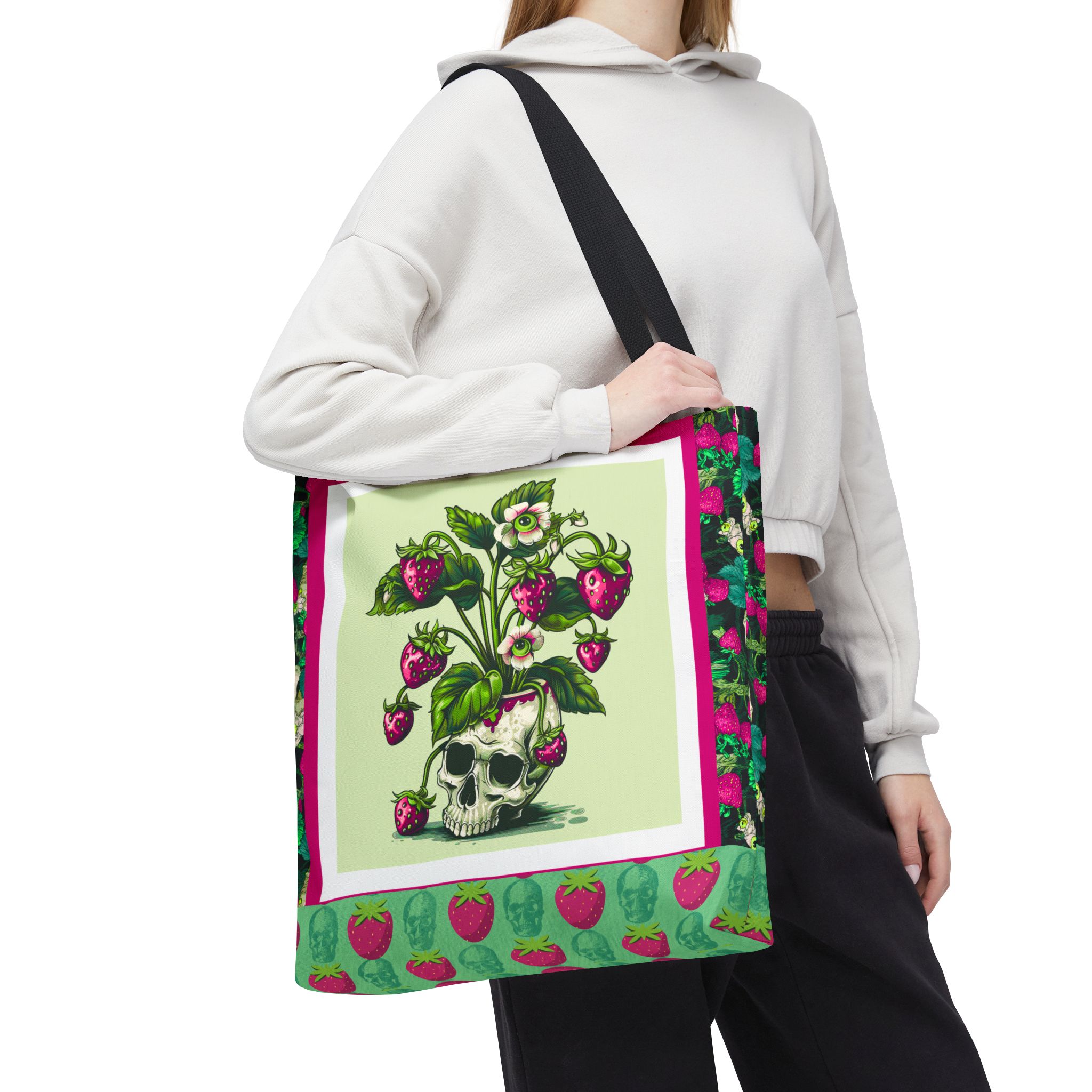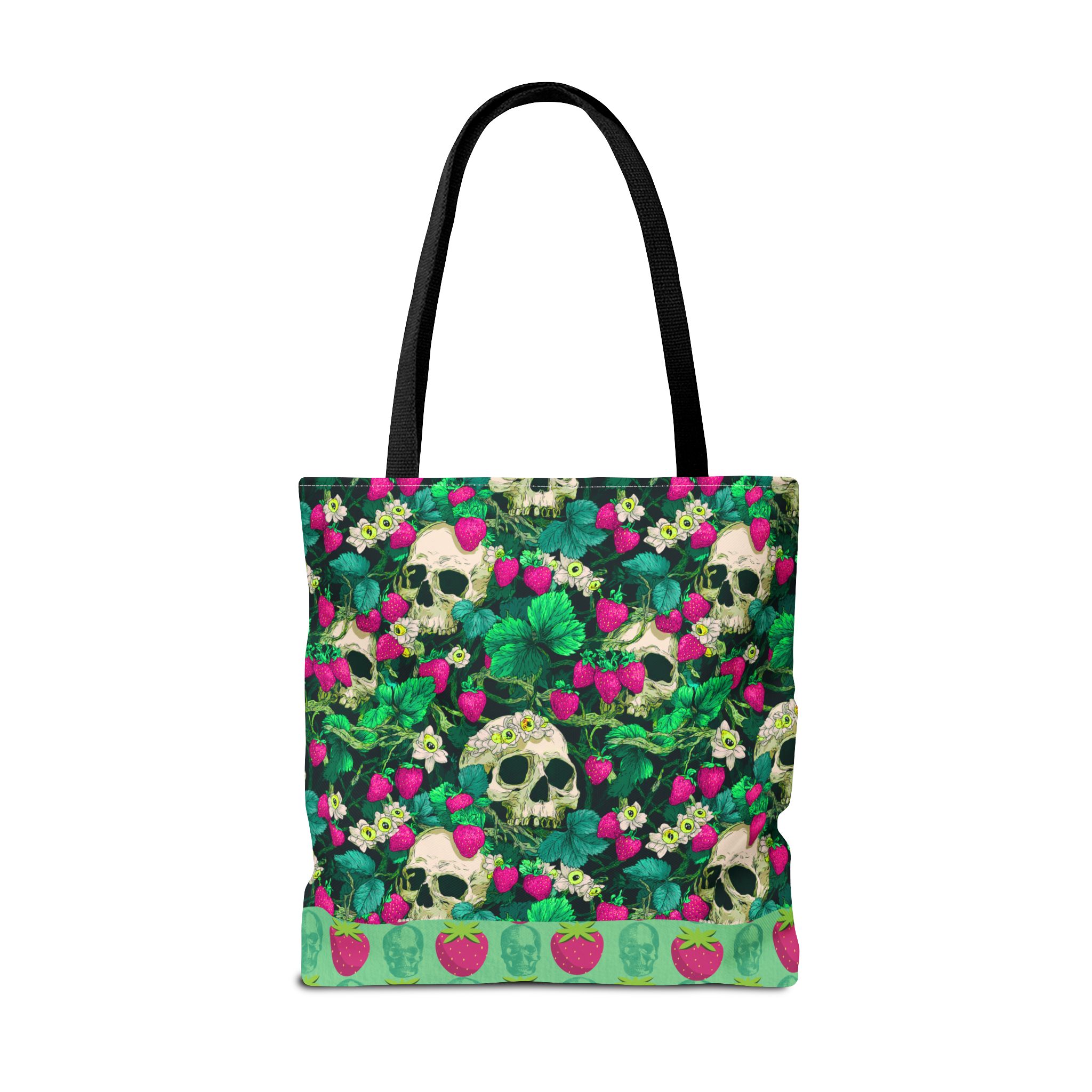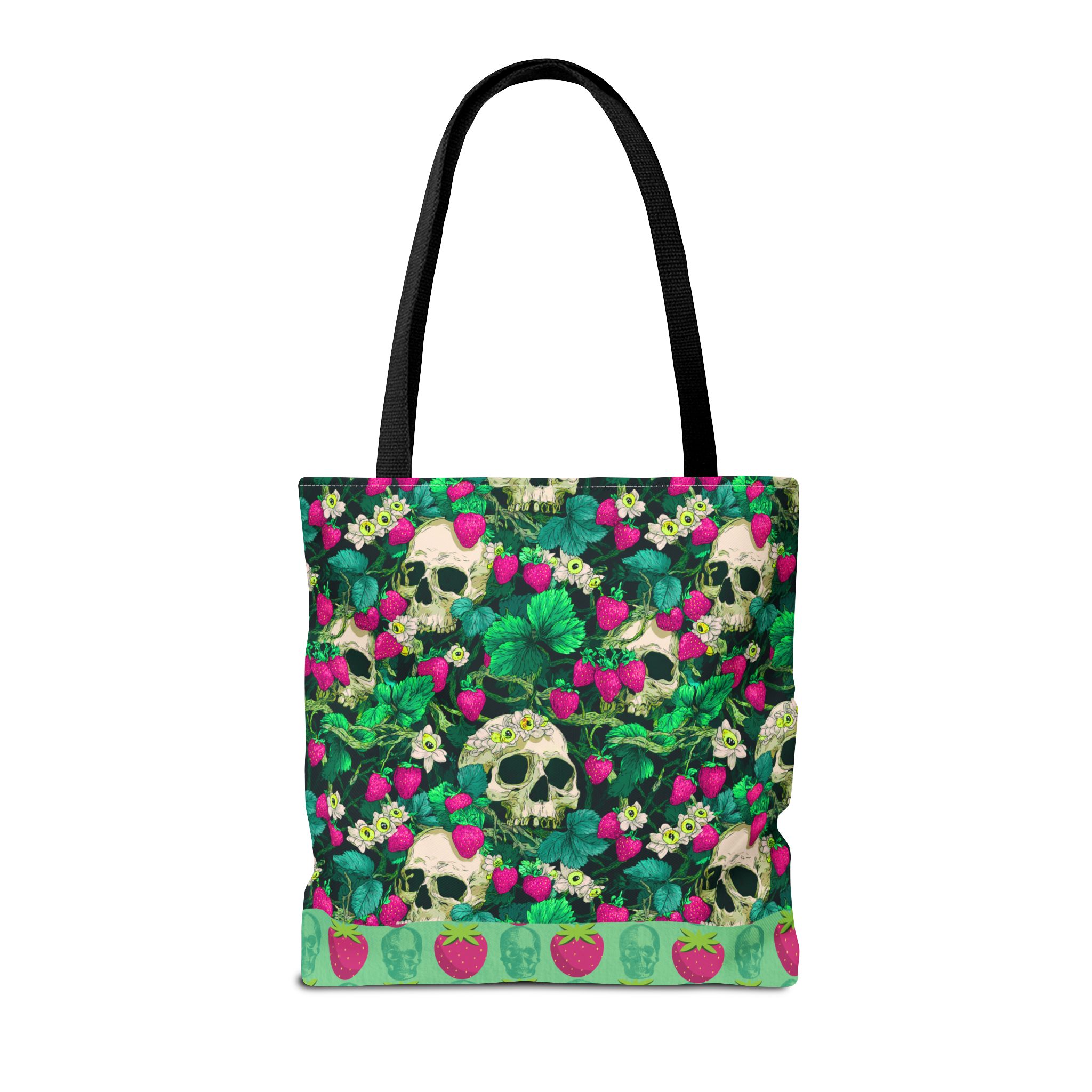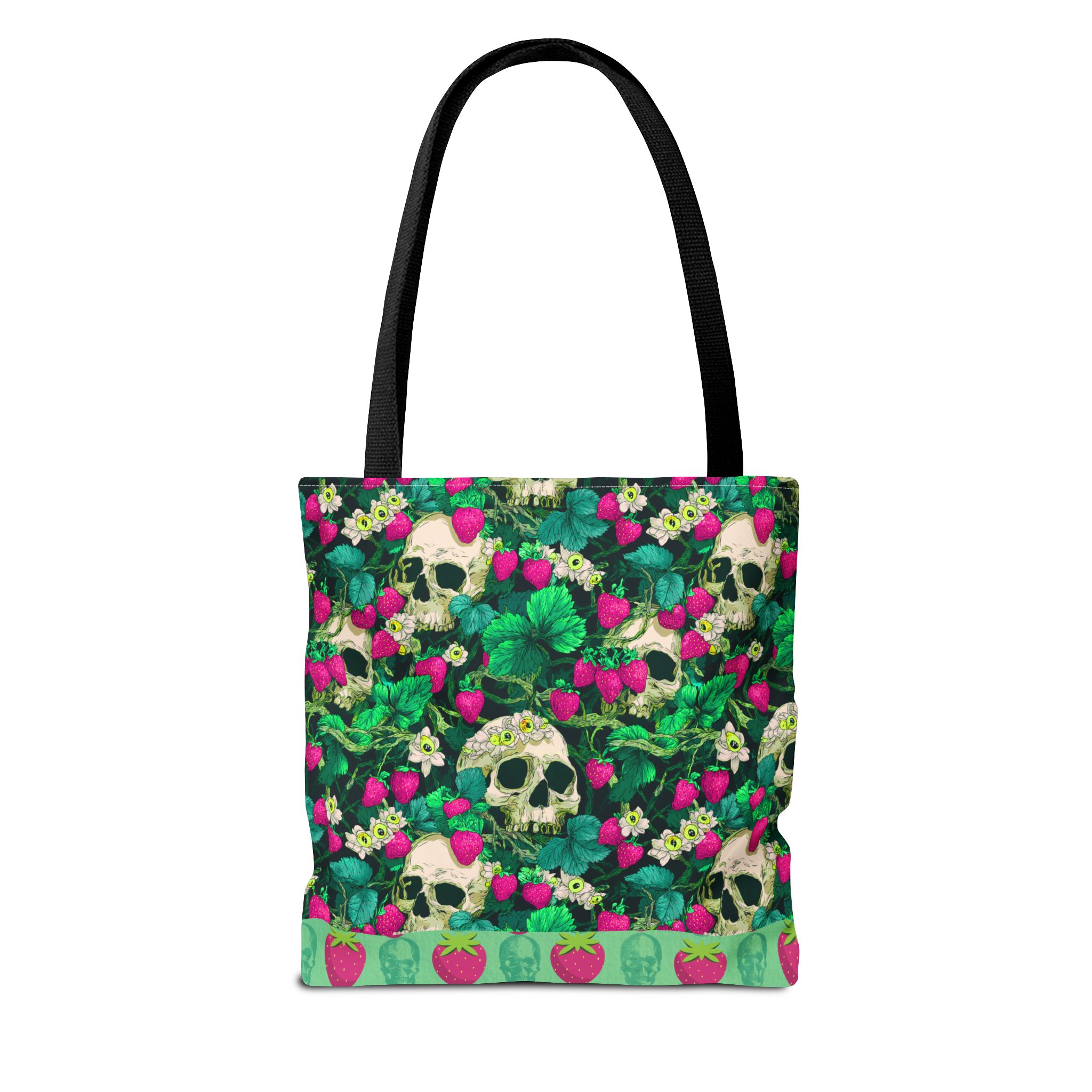 Sweet rot, meet daily slay. This bold gothic tote features a striking magenta-and-green skull-and-strawberry design—like a haunted harvest straight from the garden of the undead. Spacious, sturdy, and stylishly strange, this tote is your perfect companion for grocery runs, beach days, or casually creeping through summer festivals.