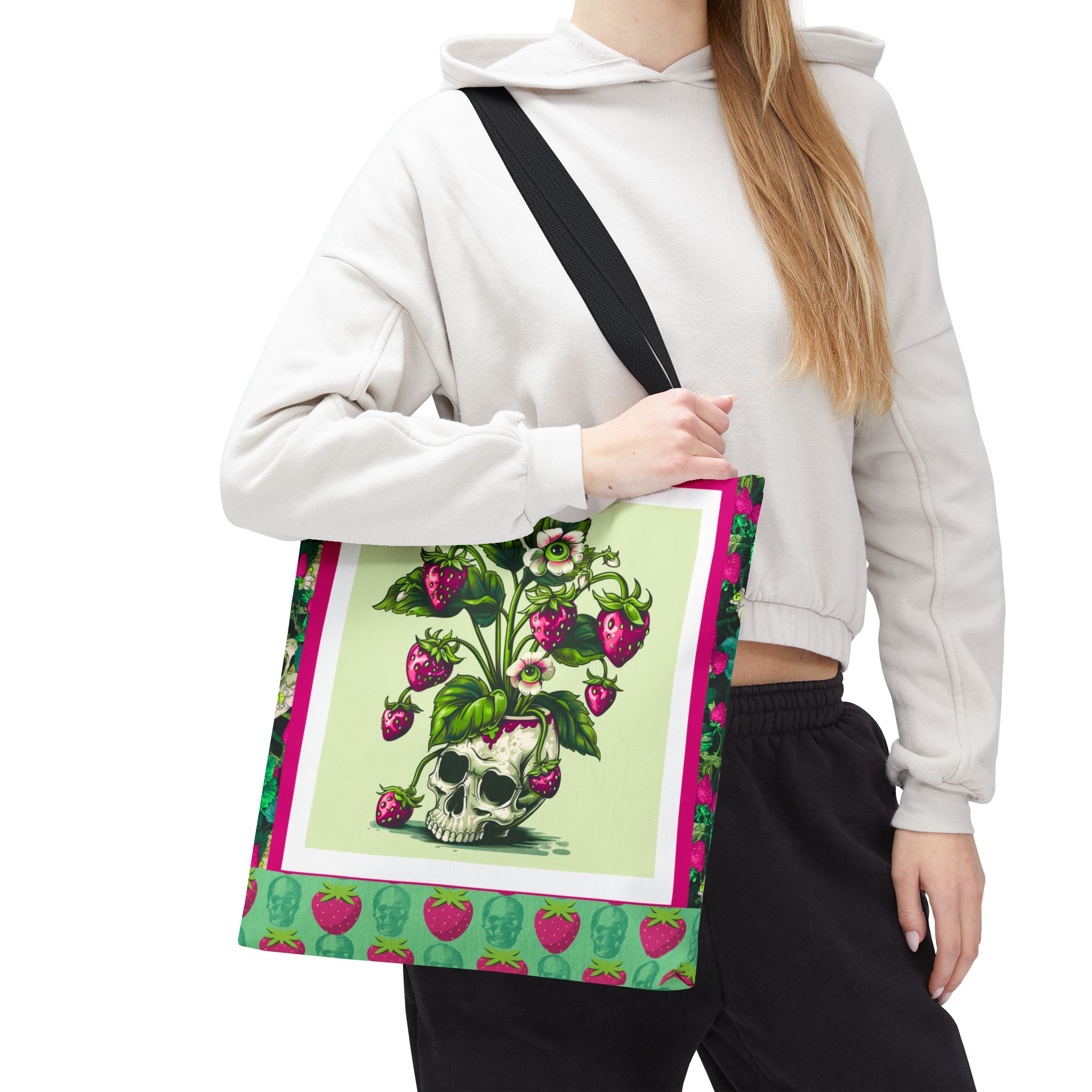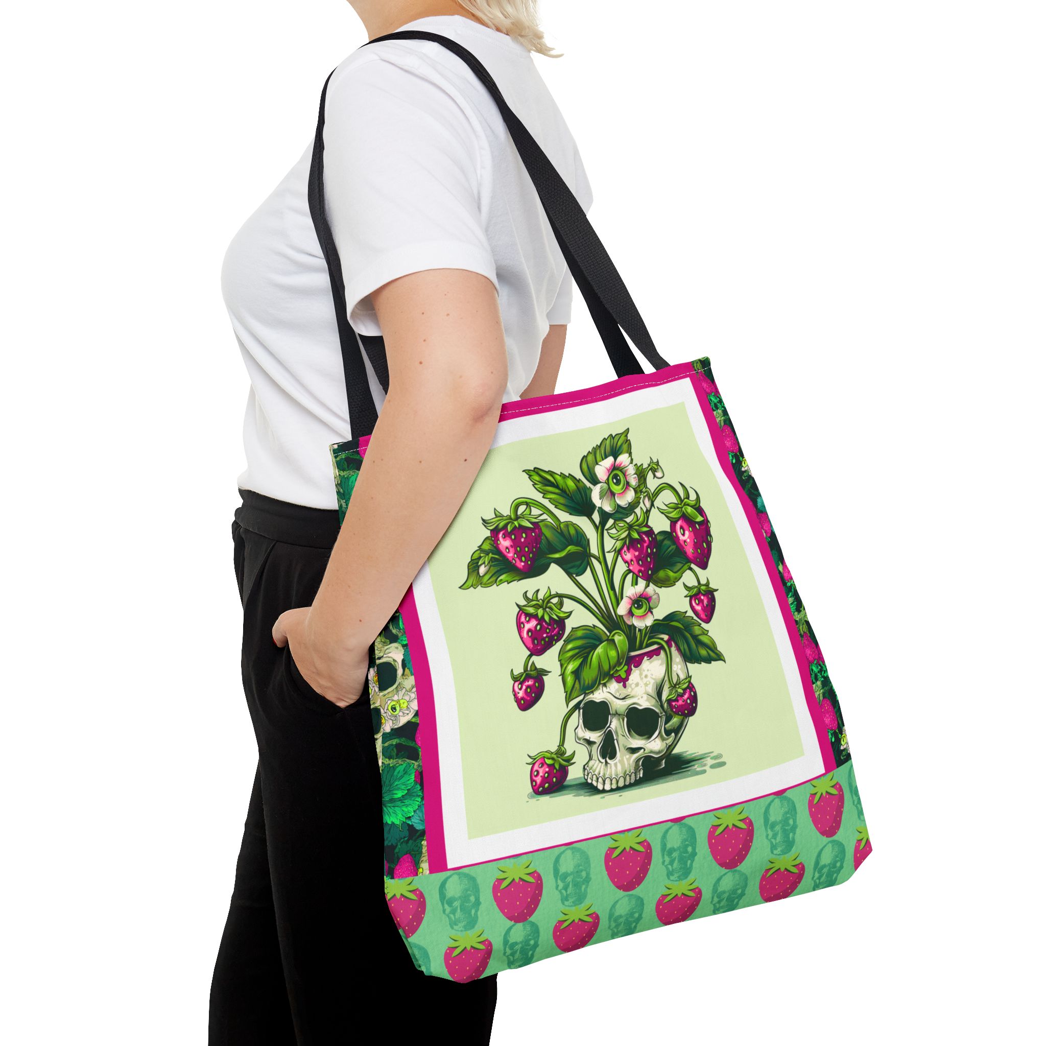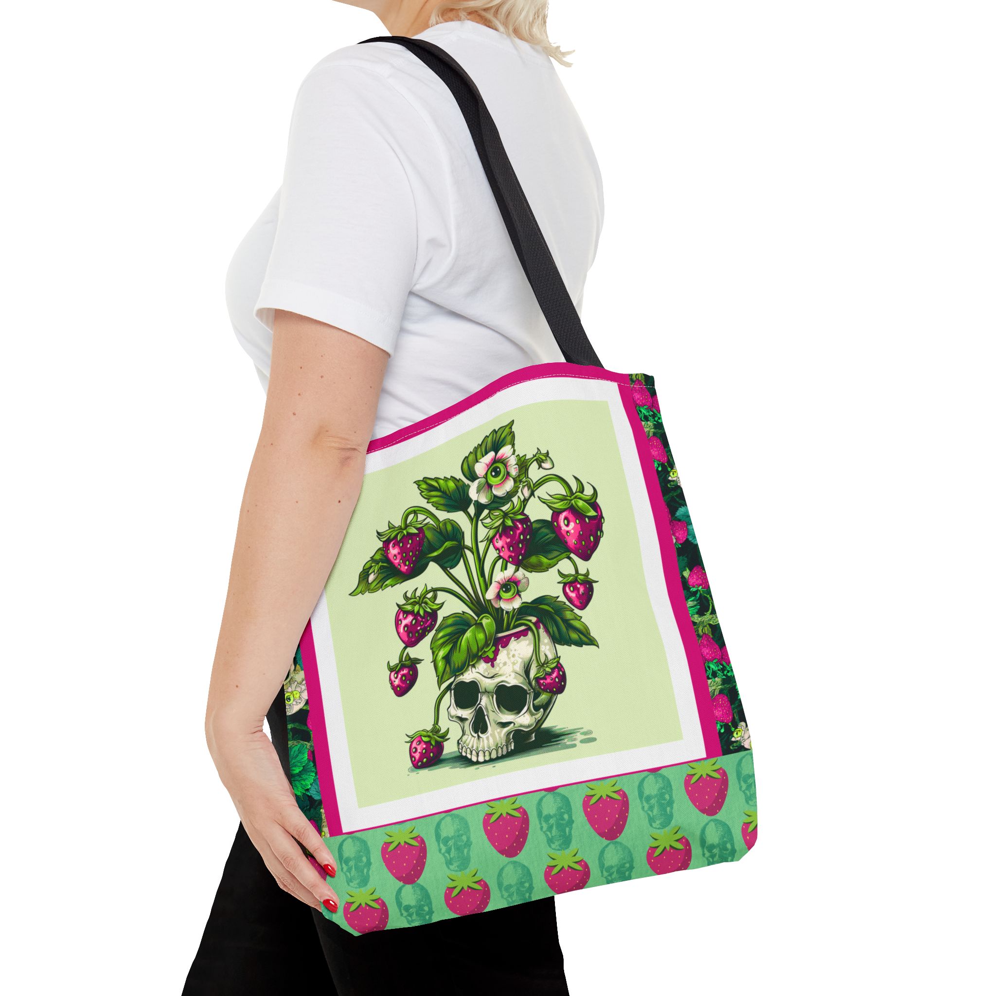 Sweet rot, meet daily slay. This bold gothic tote features a striking magenta-and-green skull-and-strawberry design—like a haunted harvest straight from the garden of the undead. Spacious, sturdy, and stylishly strange, this tote is your perfect companion for grocery runs, beach days, or casually creeping through summer festivals.