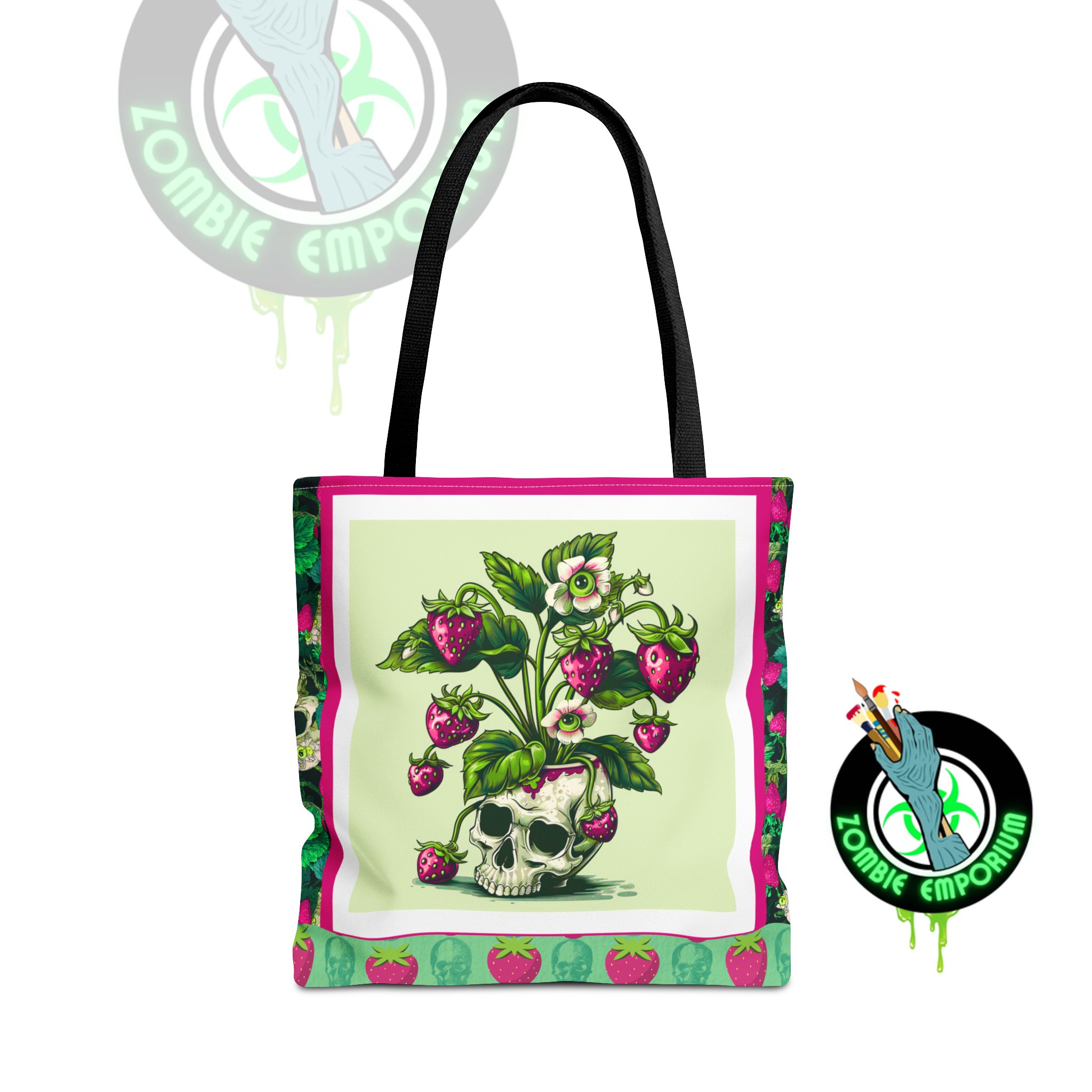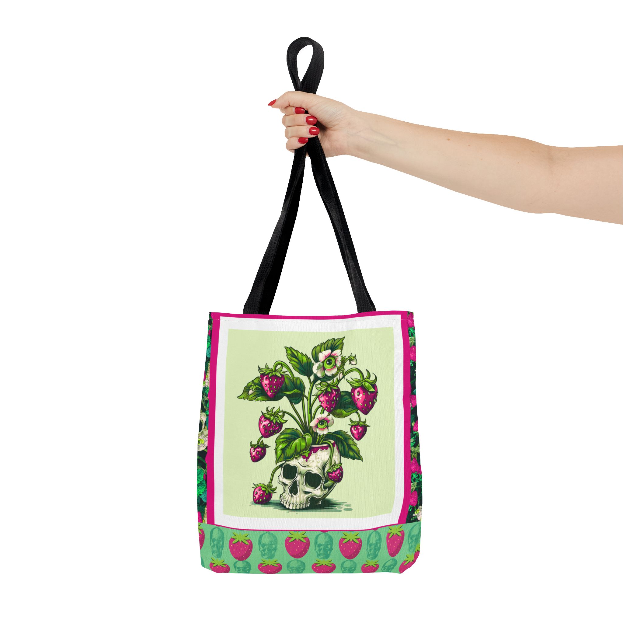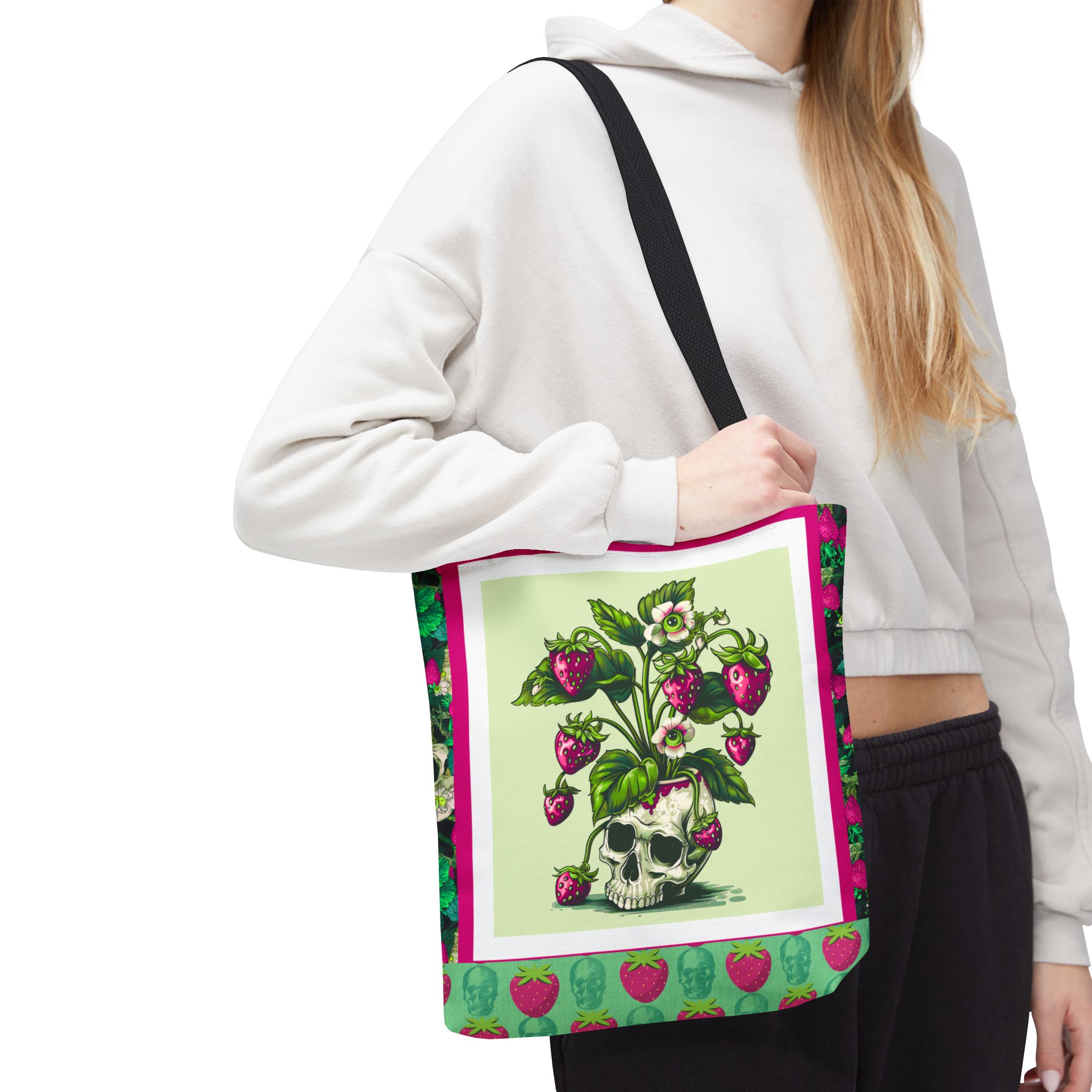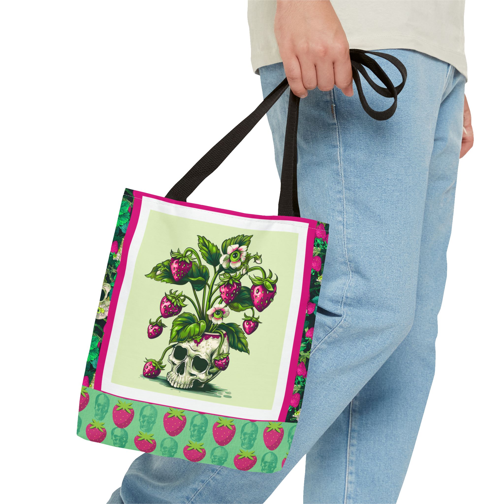 Sweet rot, meet daily slay. This bold gothic tote features a striking magenta-and-green skull-and-strawberry design—like a haunted harvest straight from the garden of the undead. Spacious, sturdy, and stylishly strange, this tote is your perfect companion for grocery runs, beach days, or casually creeping through summer festivals.