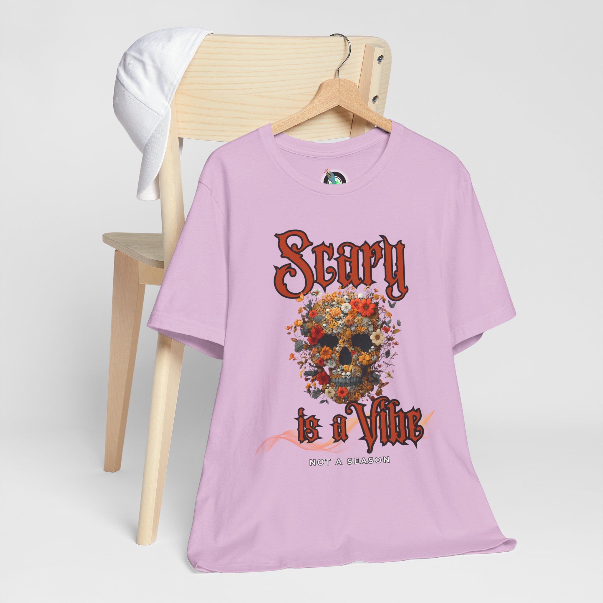 Bring cozy chills to your everyday look with the Scary is a Vibe Skull & Floral tee. A haunting skull framed by autumn flowers and leaves reminds everyone that spooky beauty blooms year-round. The gothic text “Scary is a Vibe” and “Not a Season” complete this eerie-elegant design.